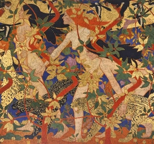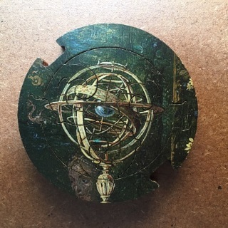The puzzle folks didn’t design a special cut for the Burne Jones, so the whimsies aren’t as integral. That’s a pity: I would have islanded each sphere, inlaid suns, moons, stars, creatures of the sea and earth, an Adam and an Eve. . .But there’s a lovely inlaid ballet, all in feathered tutus.