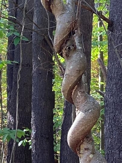 This tree was corseted by a vine, since cut away by foresters. It looks like an awful warning in a Victorian dress reformer's woodcut.