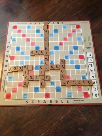 to teach him the game. In their beginner's version, all the tiles are face up, so he could just find the letters he needed. He asked for help with some of the spelling, but he thought of all the horizontal words and set them down: BOOM! (with the blank tile standing in for the exclamation point, which he insists is part of the word), SNAKE, CRASH, GOAT (he wanted to do GHOST but couldn't find another S in the blankets), and TOTORO.A picture exists of him putting down the last O in TOTORO. He said that going over the edge of board meant that he'd won the game: "I can use all those word-weapons."