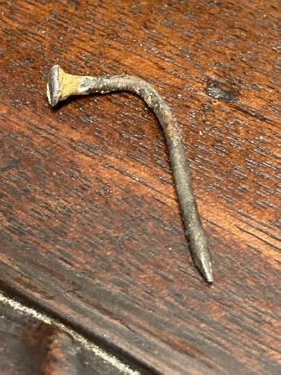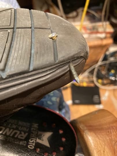 I mean it went straight into the sole, turned a sharp right angle, and came out through the inside edge, protruding a good inch. Never felt a thing. I can't imagine where I picked it up, or how it got in there without my noticing, or (indeed) got in there at all. It took some tugging with pliers to lever it out.
