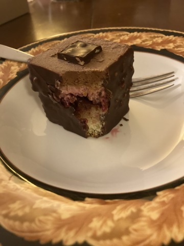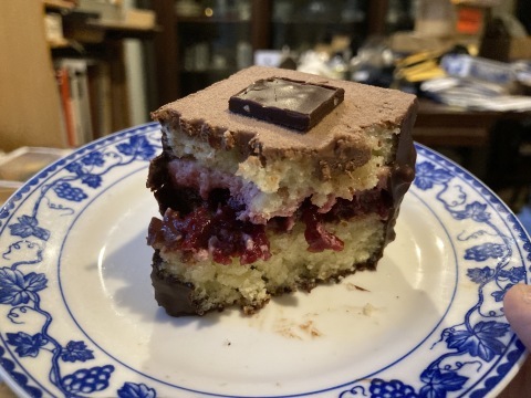 , to which I brought Tatte's perfect stone-fruit galette and the first new cake from Burdick's that I've seen in ages. The last was their Euclidean triangle filled with passion fruit mousse, and I think the Earl Grey spotted with blueberries came before that. The Georgetown is deep dark sour cherry compote on an ethereal cherry mousse on almond sponge, and clad in dark chocolate. It's not iced but enrobed, so there's that slight brittle resistance of biting into a soft-centered chocolate. Sublime!