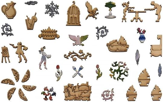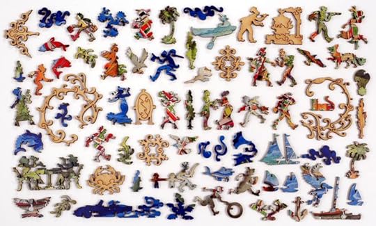 The choices at Liberty are getting harder. The problem is that they’ve spoiled me. Quite a few of the remaining images that I love best (Vermeer! Bruegel! Botticelli!) were designed in Lynon Aksamit’s prentice days, before he had quite developed his cutting style, before his characters had character. I’m finding fewer puzzles like Sight, where the cut and image both are fabulous. So: gorgeous painting, and a timid little handful of whimsies in rubber-bandy shapes; or absolutely brilliant whimsies (remember that lobster? like that) but with meh images. I ended up getting that Story Map of France instead of the 1576 Map of Paris I’d had my eye on, sheerly for the stunning whimsies. What I've taken to doing, instead framing and filling in, is to find all the whimsies first, and let the puzzle coalesce around them. I still leave the best for last.