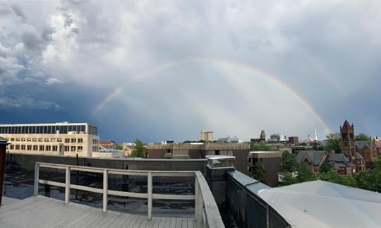 Walked home against a bruise-black stormfront and a vast, uncompassed wind. Ran upstairs to the roof at once, just as a hail of rain was ending, and caught this faintly double bow.