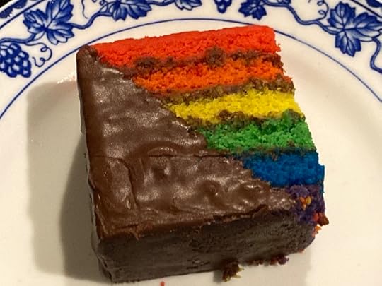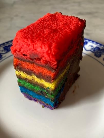 Happily, I can slip into bookstores and bakeries now. Tatte makes a fabulous Pride Cake, with layers of almond frangipane and Valrhona chocolate, and such glorious clear intense colors! Every crumb in a good cause.
