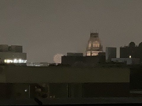 Oh yes. It was the Fourth. Last year, the street bangs were incessant, all summer long. This year, the proper fireworks weren’t quite a wash. The rain, which began as a blessed relief from that appalling heatwave, had gone on and on all week. “My boots are full of Clyde water,” I’d say, and hang another pair of socks out over the tub. But on Sunday, after days of downpour, it had been nice enough to play outdoors: pleasantly coolish, fitfully overcast, with fleeting glimpses of sun. There even was a lovely clear sunset. I had hopes.
