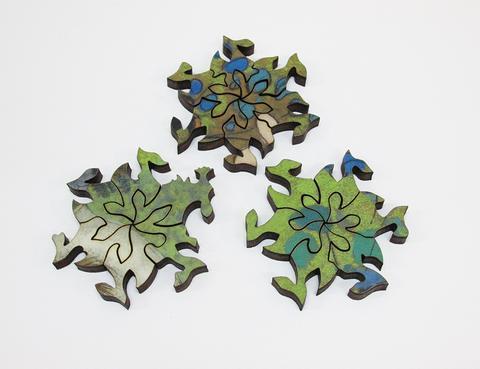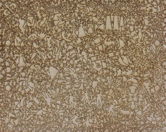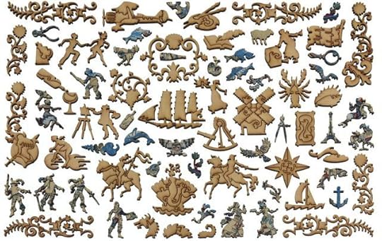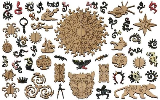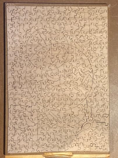 Now that I feel up to reading more intently, I’ve been puzzling less. Still, I’m a member in good standing of the Hoefnagel Wooden Puzzle Club (which has a very large and varied library, mostly Artifact, but with some jigsaws from Liberty, Peaceful, and assorted handcutters); still getting a new Liberty whenever my number comes up (every two months or so), and a new Artifact when a really pretty one, like “The Unicorn in Captivity,” comes back into print. I’ve done over 23,000 pieces since May.