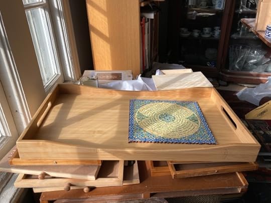 Then on Saturday, I discovered Ottoman Trays. Doesn’t that sound impressive? The chichi ones in rare woods are quite popular on wedding registries. I got one in bamboo: very light, very pretty, and twice the size of the sorting drawers. It came on Monday, and it’s brilliant! It fits on my knees, with a corner resting on—of course—my ottoman. I can turn it easily to any angle. And most puzzles that I do—not all—will fit entirely within it.