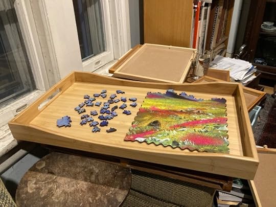 I thought of and rejected those bed tables with fold-down legs: they’re not quite big enough for the puzzles in my queue, and can’t be turned portrait. The puzzle boards with legs I've seen tend to be spindly and overpriced, and too wide for my chair.