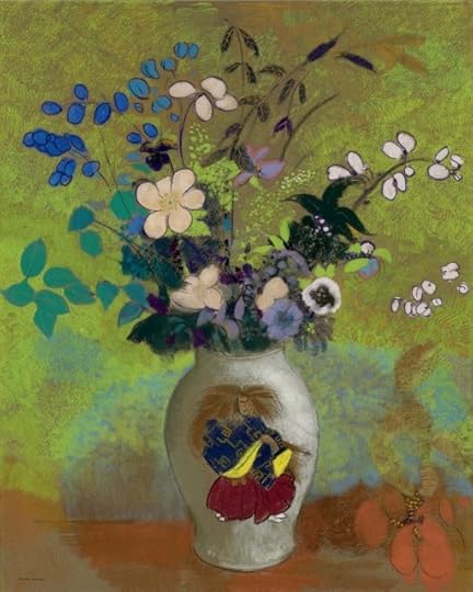 I love how the fierce little warrior is held in the moon-curve of the vase, and how one black flower is a crow.