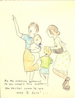 Kind docents had scattered all of Gashlycrumb Tinies about the house, for children to find: Amy on the stairs, head downward; Titus's mystery box; George's legs sticking out from under the rug.