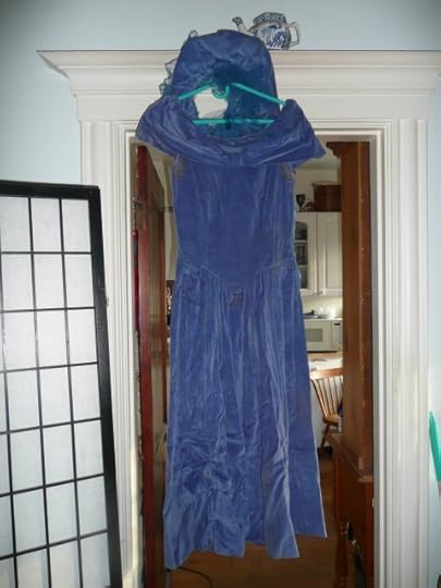 Under some educational toy skeletons and a plastic skeeball game, I found a box with my mother's wedding dress, the loveliest periwinkle blue velvet, the color of her eyes. I hadn't seen that in decades, and feared it was gone. And I found one of her screen treatments, a club story/murder mystery called "The League of Four." I found some of my childhood drawings (from my colonial history phase, at about seven or eight), and my toy punch-card computer from about 1961, and boxes of my college work. I so hope my paper on Antony & Cleopatra is in there, with the professor's comment: "O rare