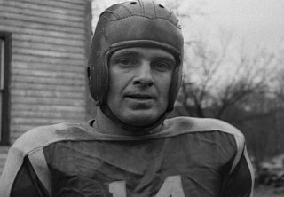 Here's my father, paused in a newsreel in 1938, a few years after the Talk of the Town called him "a smiling young man with a vicious body block." Here (as then) he's about to wallop hell out of one of his own homemade tackling dummies, this one a scowling man-shaped monster (back in the day, I used to paint individually villainous faces on them, never two alike). He would pose with a classroom full of them, like a school for Archer's Goons. Later on, he was filmed driving a hydra-headed machine of his own invention, snorting and shooting out a random sequence of rams at a startled Heywood Hale Broun. He always said he invented his practice equipment to give the players something else than the runt of the team to clobber. He spoke feelingly: playing for the Connecticut Aggies at 142 lbs, he was called the "watch charm guard." A luckpiece: he was All New England and a runner-up All American for 1929.