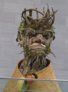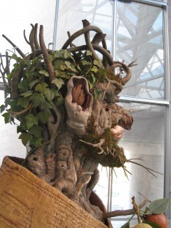 "The northernmost ... was of a gnarled, woody ancient; his mouth was collapsed where the teeth had fallen out, his skin all warts and folds, eyes rheumy and peering. He was not, however, like wood or woody or rooty (Bruno came closer) but in fact made of wood he was nothing but an aged chestnut stump, yellow leaves or few or none for hair, his ear a broken limb's rotted bole, his lips a fungus.