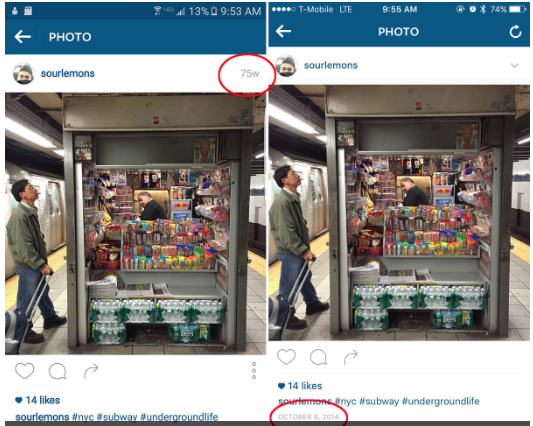 Instagram has finally responded to our pleas of getting lost in a social media time warp. Rather than having to calculate how many weeks ago your fav pic of your Valentine’s dinner was posted the social media mogul switched to applying a simple month, date, and year format. Hallelujah. The update is slowly rolling out to users so if you don’t see it yet don’t panic, all good things come to those who wait. View image below. Instagram saves the day with this new update, so now you can use those math skills for calculating how many days till spring has sprung. (Source Mashable)