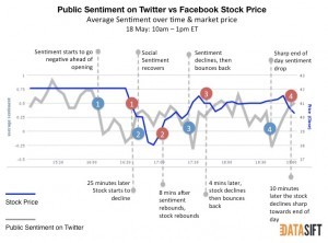They looked into how public sentiment, either positive or negative, on Twitter affected the initial Facebook stock price. Data Sift found that there was between a four and twenty-five minute delay, followed by a change in stock price that was very much in line with any major shifts in sentiment.