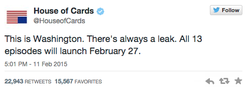 On Wednesday, Netflix accidentally released the third season of “House of Cards” two weeks before the release date. A Netflix rep told PEOPLE, “Due to a technical glitch some Frank Underwood fans got a sneak peak. He’ll be back on Netflix on Feb 27. #nospoilers.” Naturally, fans of the Netflix original series went to Twitter to share their excitement and emotions about this unexpected early release. The 10 out of 13 episodes that leaked were only up for about 15 minutes before Netflix realized the mistake and took the episodes down. House of Cards acknowledged the mistake and embraced it by sharing a funny tweet with their followers.