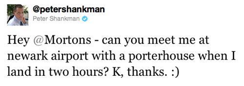 This tangentially continues the travel theme. As he was boarding a flight, Peter Shankman jokingly tweeted Morton’s Steakhouse asking if they could deliver a steak to the arrivals lounge.