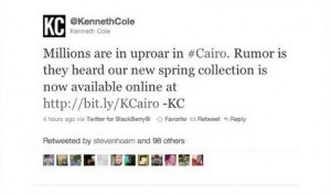 Some companies showed concern and hoped for peace in Egypt. Kenneth Cole tried to make a joke out of the situation, claiming their latest collection was the reason for the Middle Eastern revolution: