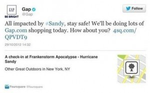 Source: http://mashable.com/2012/10/31/gap-tweet-hurricane-sandy/