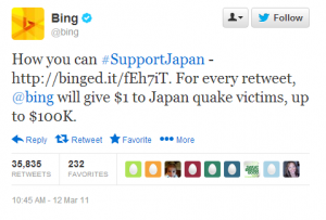 Bing was hoping for 100,000 retweets to promote the search engine – because only that would make Japan worthy of the donation (hope you picked up on the sarcasm there).