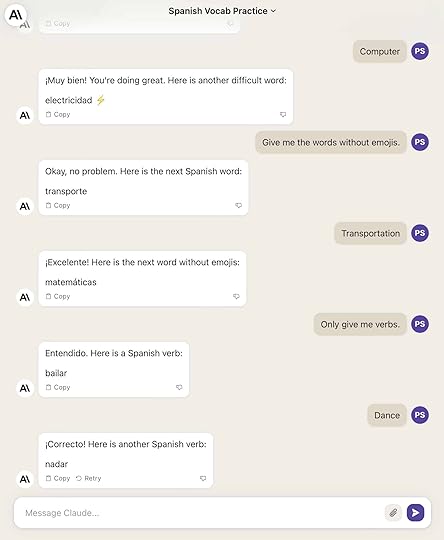 EspañolClaude did mucho mejor when I tested my Spanish skills. (I used to be fluent.) Note how it responded below when I asked it to stop showing me answer-related emojis and only give me verbs: