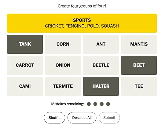 A while back, an intriguing new one appeared: Connections. The goal is to group 16 words into four groups of four based on a single commonality: