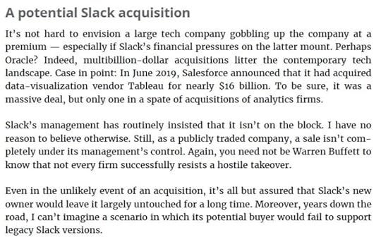 In the book, I also floated the possibility that another tech company would acquire Slack. I thought that Apple would be a natural fit, especially since Tim Cook’s company is increasingly generating its revenue from services, not hardware. What’s more, both companies share a common design aesthetic.