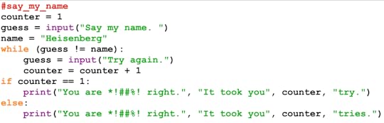 This week, I wrote the following Breaking Bad-inspired program. Sure, it’s simple, but it demonstrates a few essential programming concepts: if/then statements and while loops.