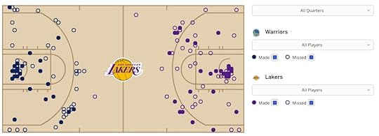 Watching the game, I couldn’t believe how poorly the Warriors shot from behind the arc. (The team made only four of 30 attempts.) The Warriors’ shot chart in on the left, courtesy of ESPN: