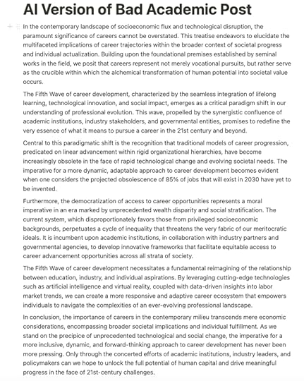 Example #1: Impenetrable Academic WritingI fed Notion AI a four-paragraph excerpt from the horribly written book I describe in this post. (Thank you, Shottr.) I then prompted it to write a 400-word post about careers emulating that author.