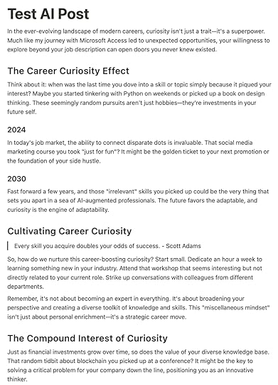 Next, I immediately noticed the heavy use of the word curiosity and blatant references to some of the specific words I used in my original, human-generated post. The date-related headers above aren’t coincidences, either. AI sensed a pattern from my post on curiosity and, for better or worse, replicated it.