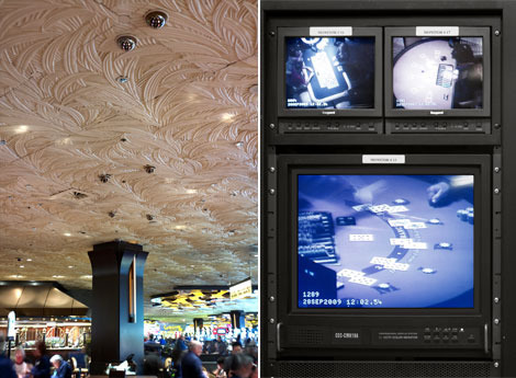 Three types of cameras feed the video wall in the Mirage’s surveillance room (right). Fixed-field-of-view units focus on tables, motorized pan-tilt-zoom cameras survey the floor, and 360-degree cams take in an entire area.