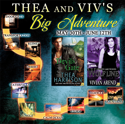 …that Thing #3 would occur. Since we both love to travel, we’ve decided to have a BIG ADVENTURE together. We’ll be traveling on a blog tour, sharing snippets from our stories and our other travels. Thea’s June 5 release is DEVIL’S GATE, book 3.5 in the Elder Races world. And on June 12 my novella returns us to the Granite Lake Wolves with WOLF LINE.