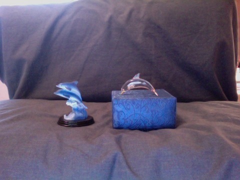 On Monday I showed the wolfie part of my bookcase trinkets. Here are the two for the Forces of Nature books- the glass one was for Tidal Wave, the blue dolphins–very appropriate for Whirlpool!