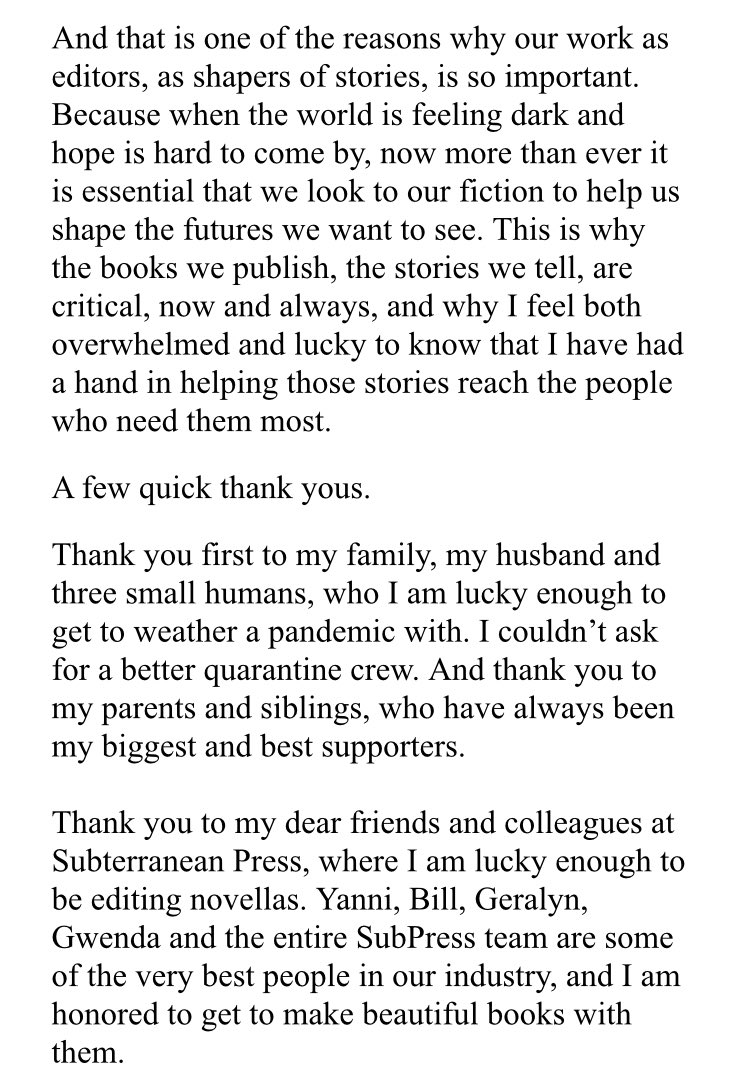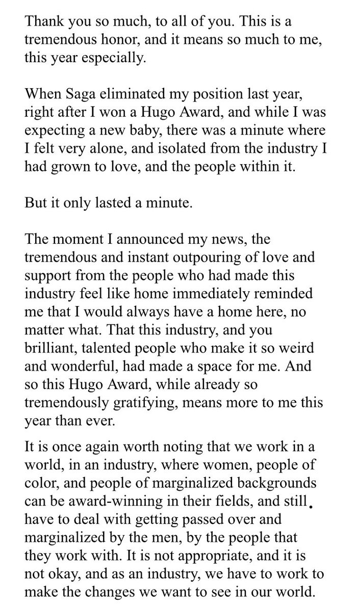 Also please don’t ignore the fan categories (Fanzine, Fan Writer, Fancast, Fan Artist), because the fan categories are full of great finalists who do amazing work for little to no money, all for the love of the genre. And no, I’m not just saying this, because I’m one of them, though I’d of course be thrilled if you were to vote for me. You can also still download my Hugo Voter Packet here, if you want to see what I wrote in 2019.