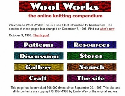 For about 6 or 7 years in the 1990s and into the early 2000s, Wool Works was the online knitting resource. It wasn't the only site, but it was the largest, and it was the most active. It had a section of tips & techniques, it had free patterns (notably, the KnitList Christmas gift exchange patterns), it had a gallery of finished projects, it had links out to other online knitting resources (knitters were starting to maintain personal sites, the forerunners of blogs). It had a spinning section, which seemed seriously radical to me at the time (eating my words, as I look at the huge box of roving beside my desk), and a list of stores. The store list was particularly wonderful, as I was travelling on business a lot at the time.