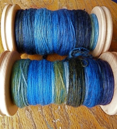Both bobbins have 2 ounces of fiber on them. Why is one so much fuller? Did I cheat and spin the fluffy fiber woolen?