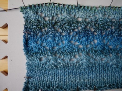I really like the stitch pattern in this yarn, but I want to try going up a needle size, just to see. I'm thinking about a crescent style shawl. What do you think?