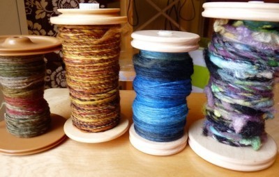A bobbin spun from Bricolage Studios' handpulled roving. This one I just let rip, it's lumpy, bumpy, thick, thin and all kinds of textured. Right now it's just hanging out. I may ply it with some shiny thread.