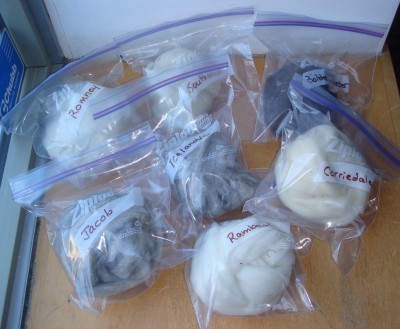 Once I've mastered the basics with the BFL, I'm keen to get started into a little sampler project that the lovely Sue put together for me. I've got a collection of little bags of rovings from various breeds – each is enough to try it out, get familiar with the fiber, and experiment.