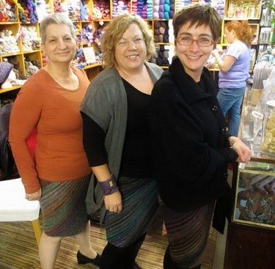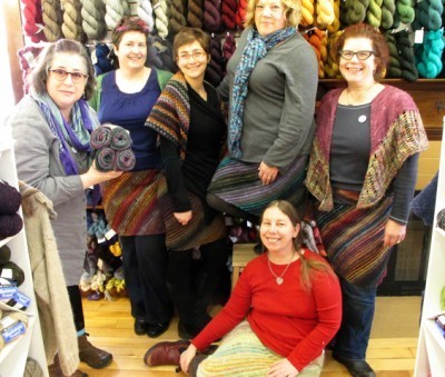 The contagion continues to spread… Kate inevitably infected Denny (although their styles are very different, they are spiritual knitting twins), Lynne passed it to Sue, and Jillian and I finally found a sheep-free yarn for Amy to knit one of her own, Lang Yarns' Sol Dégradé. Last weekend, we once again gathered around Lynne for a new photo op.