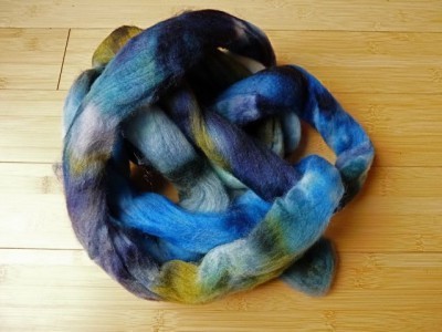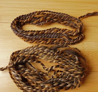 Southern Cross Fibre Falkland, colorway Dirt. I'm going to spin a woolen 2-ply, with probably a little extra ply twist.
