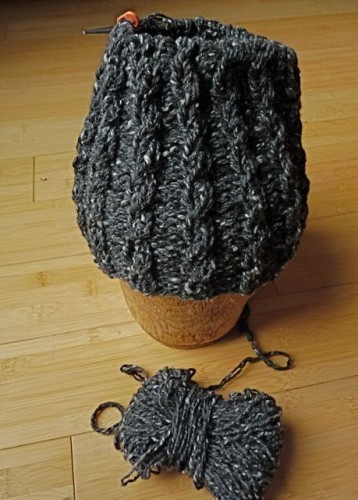 This hat and I have had many words. It's an easy pattern, a cable rib, but it took me four tries to get it right. Now it's going to be a hard gift to giveaway.