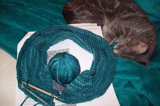 KarlaJ's cat George is helping her knit the Shapely Boyfriend Cardigan.