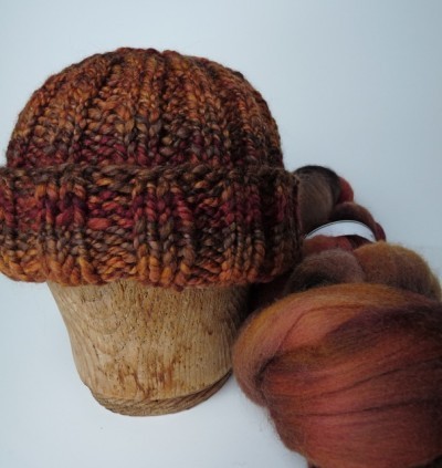 Chunky 2-ply Polwarth, spun woolen. The colorway is Hopworks from Abstract Fibers. The color was inspired by a line up of different beers at a local pub and this hat is going to a friend that's a brewer.