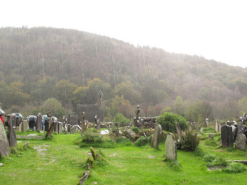 A torrential downpour goes well with a walk in a graveyard (@ Glendalough Monastery)
