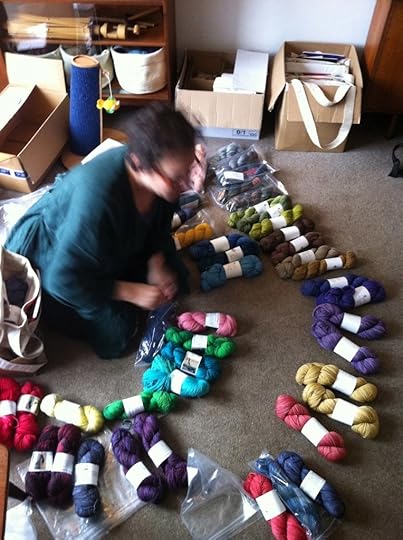 Brenda sorts the yarn, provided by AlishaGoesAround, Anzula and Indigodragonfly, destined for the P3 goodie bags...a delightfully challenging job!