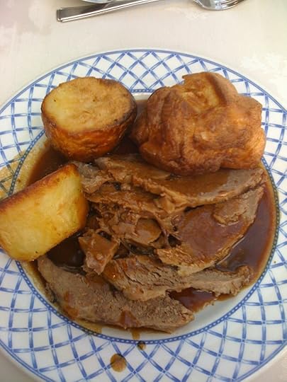 Roast beef with potatoes and Yorkshire Pudding (the veg came soon after, in heaping bowls)