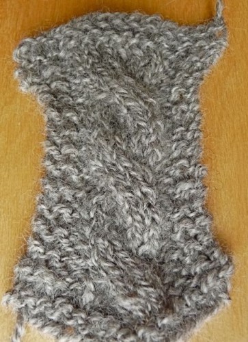 I used a six stitch cable crossed every 8 rows for both swatches. I used a needle one size bigger for the 3 ply swatch.