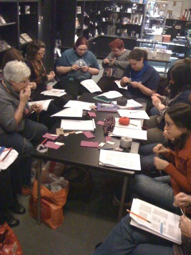 My students, busily swatching for their own shawl designs